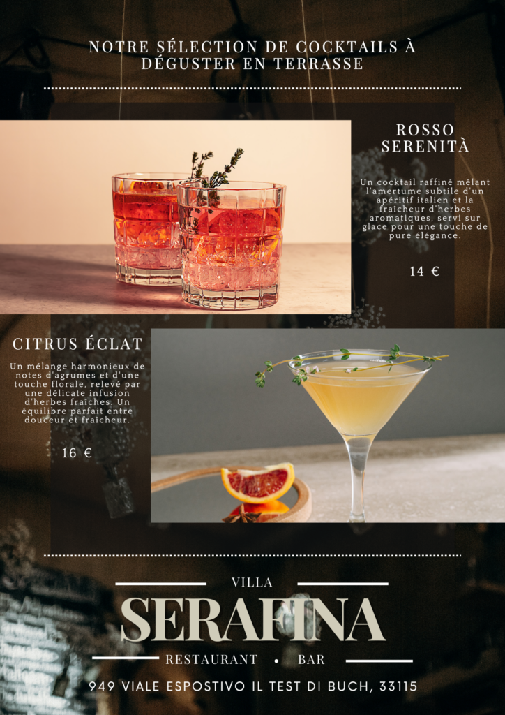 • Serafina Spritz : Une revisite du célèbre spritz avec une infusion de fruits locaux.